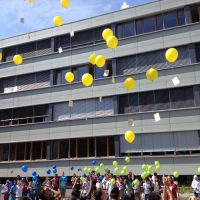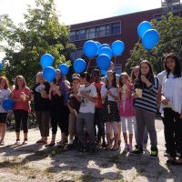 Als besonderes Highlight stand am Freitag in der letzten Stunde der fast schon traditionelle Luftballonwettbewerb auf dem Programm.Schon bei der Einschulungsfeier war durch die Wahl der Buttons jeder Klasse eine bestimmte Farbe zugeordnet worden und so starteten entsprechend die 5a mit gelben, die 5b mit roten, die 5c mit blauen und die 5d mit grünen Ballons. Von den zurückgeschickten Karten wird klassenweise die vom Luftballon zurückgelegte Kilometerzahl addiert. Die Klasse mit der höchsten Kilometersumme erhält als Preis einen Extra-Wandertag zu einem ganz besonderen Ziel.