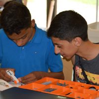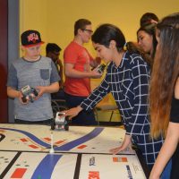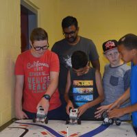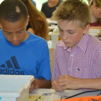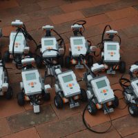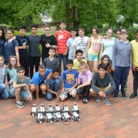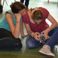 Montagnachmittag und Dienstag bauten die Schülerinnen und Schüler unter Anleitung von Herrn Winter von der Jugendherberge kleine Roboter, die sie mit Sensoren ausstatteten, sodass sie Hindernisse und Fahrbahnen erkennen und reagieren konnten – und dann wurden die kleinen Fahrzeuge auf Probefahrt geschickt.