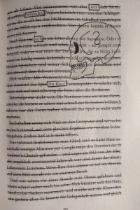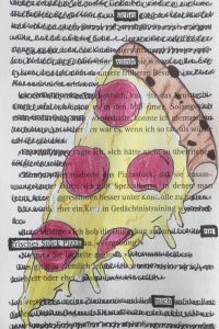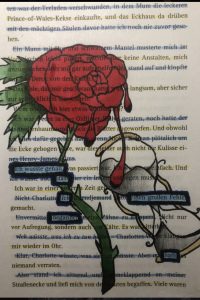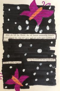 Blackout Poetry ist eine Mischung aus Lyrik und Kunst, in der auf von einer Textseite ein paar Wörter markiert, die einen ansprechen und die zusammen ein Gedicht ergeben. Alles andere wird geschwärzt. Traditionell macht man das einfach mit einer Buchseite und einem schwarzen Filzstift. Blackout Poetry hat sich aber inzwischen zu einer eigenen Kunstform entwickelt, in die Textseite mit Farben, Mustern oder sogar Bildern passend zum Gedicht gestaltet wird: