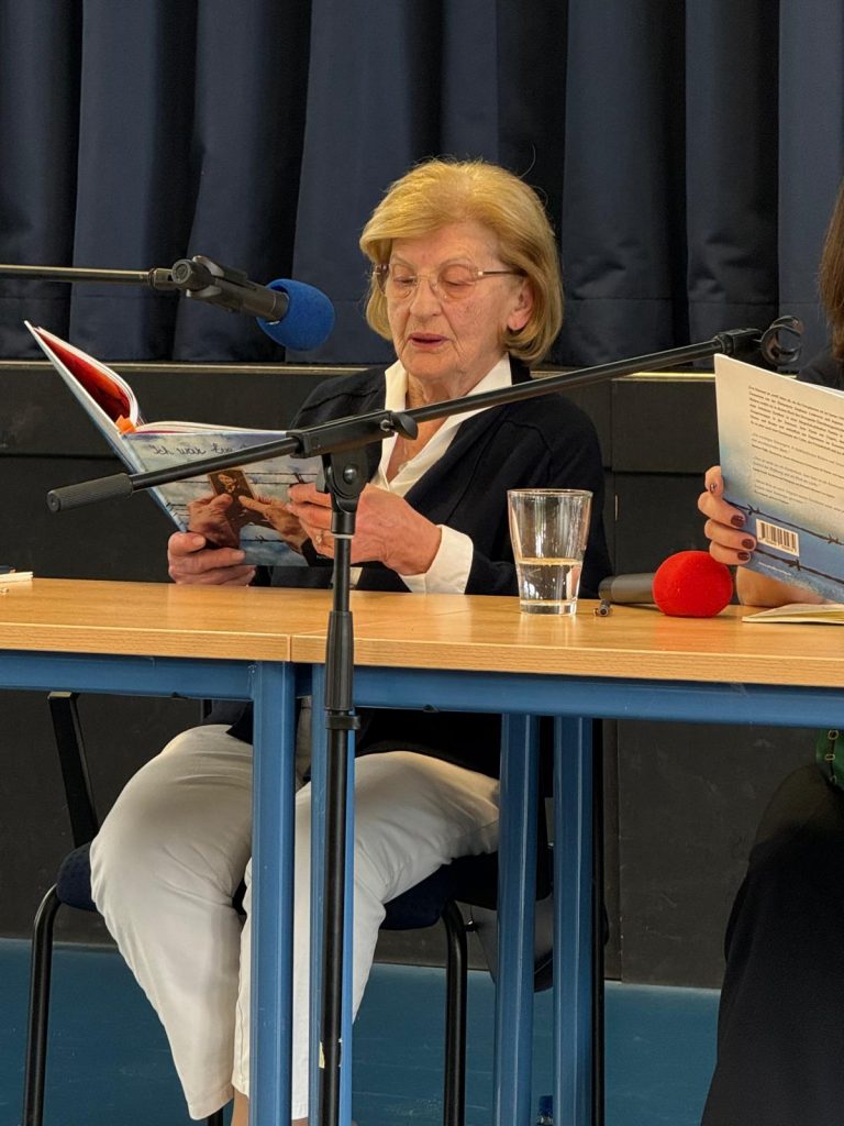 In der voll besetzten Aula hörten die Schülerinnen und Schüler sehr aufmerksam zu. Frau Szepesi berichtete nicht nur aus ihrem Buch, sondern erzählte auch von ihren Erinnerungen. Viele Schülerinnen und Schüler nutzten anschließend die Gelegenheit, Fragen zu stellen. So entstand ein eindrucksvolles Gespräch über Erinnerung, Verantwortung und darüber, warum es wichtig ist, Geschichten wie ihre weiterzuerzählen.