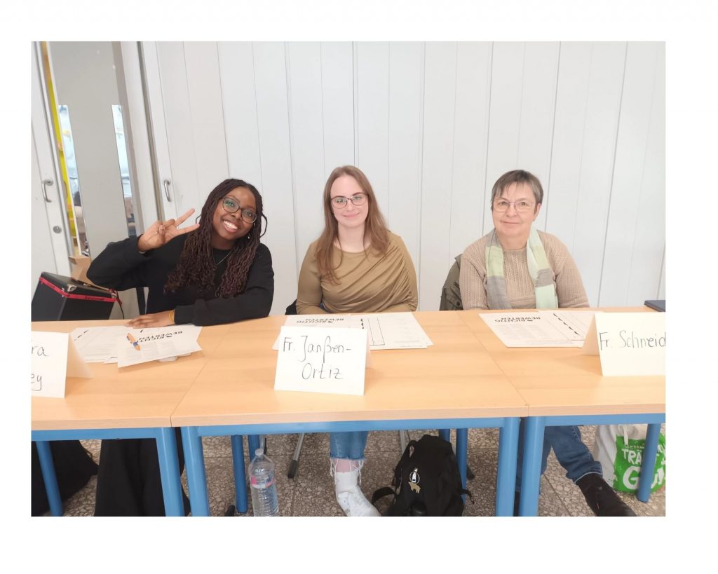Der Wettbewerb wurde von Frau Held moderiert, die zusammen mit Frau Kamal, Frau Wendenburg und Frau Gerlach für die Organisation verantwortlich war. Die Jury setzte sich zusammen aus Frau Schneider von der Schulbibliothek, Saphira Lassey, der Schulsprecherin, und Frau Janßen-Ortiz.