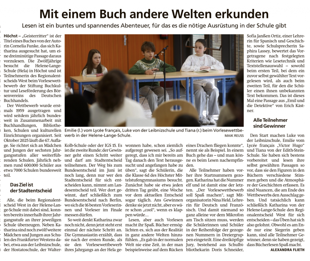 Am 6. März trafen sich Schülerinnen und Schüler aus 13 Schulen zum Kreisentscheid des Vorlesewettbewerb des Deutschen Buchhandels in unserer Schule. Begleitet von Eltern und Lehrkräften präsentierten die jungen Vorleserinnen und Vorleser ihr Können im Vorraum der Aula. Die Atmosphäre war konzentriert, aber freundlich, und das Publikum lauschte gespannt jedem Beitrag.