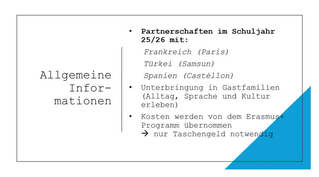 In diesem Jahr führen wir unsere Reisen nach Paris (Frankreich), Samsun (Türkei) und Castellón (Spanien). Der Frankreich-Austausch ist bereits seit über 50 Jahren ein fester Bestandteil unserer Schule und wird seit letztem Jahr im Rahmen des Erasmus+ Projekts durchgeführt.